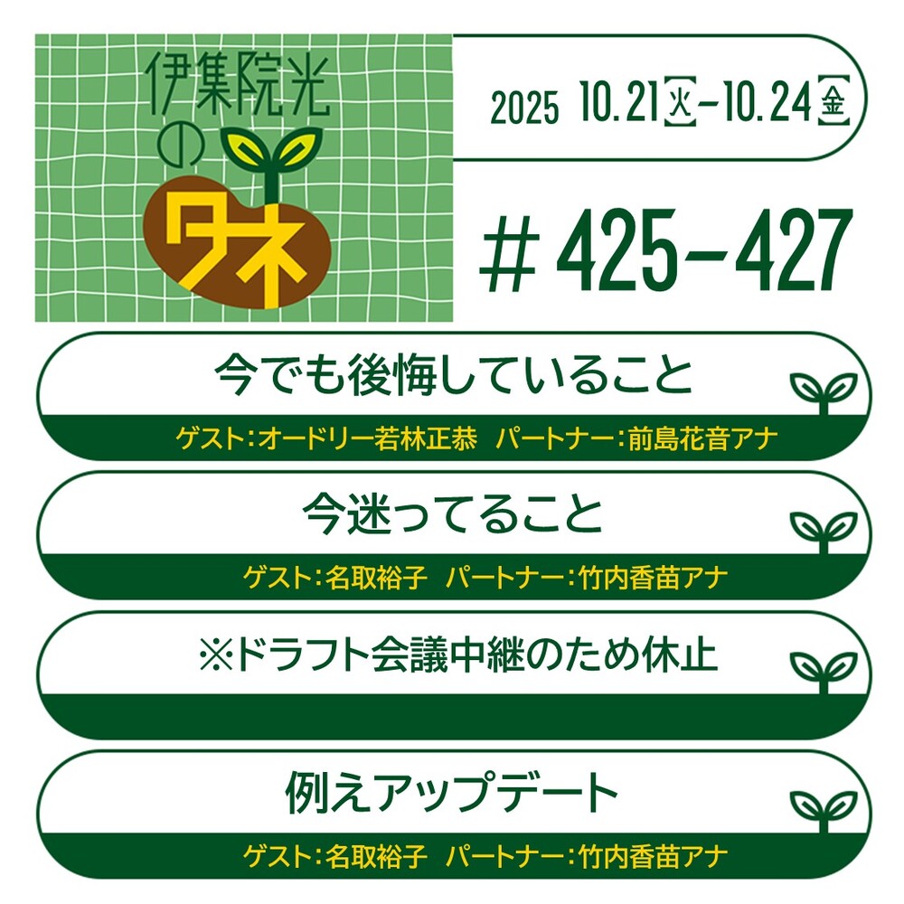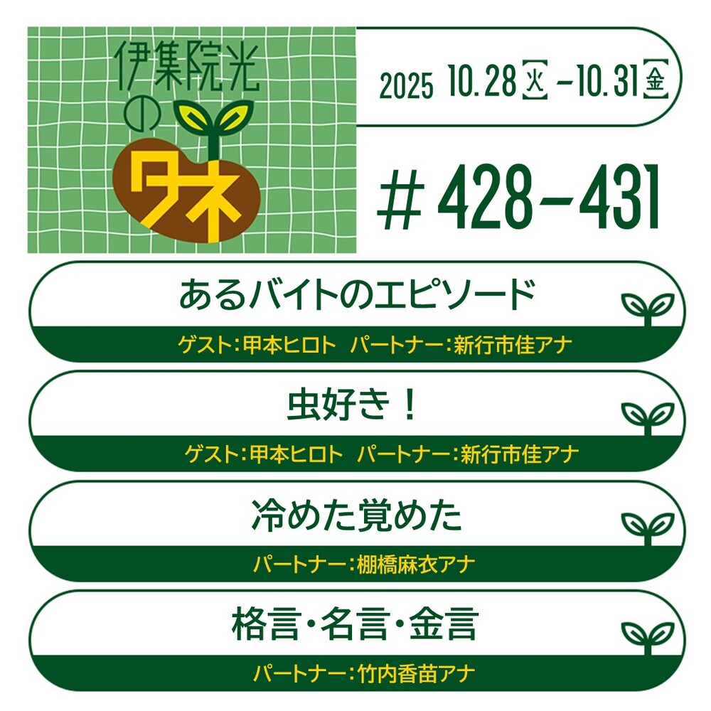 第428回~第431回 2025年10月28日~10月31日放送『09.あるバイトのエピソード』『55.虫好き!』『131.冷めた覚めた』『157.格言・名言・金言』