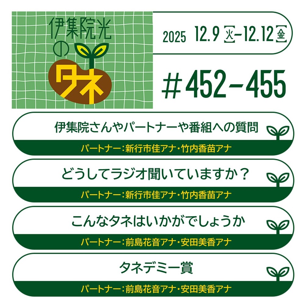 第452回~第455回 2025年12月9日~12月12日放送『161.質問』『01.どうしてラジオ聞いていますか?』『24.こんなタネはいかがでしょうか』『128.タネデミー賞』