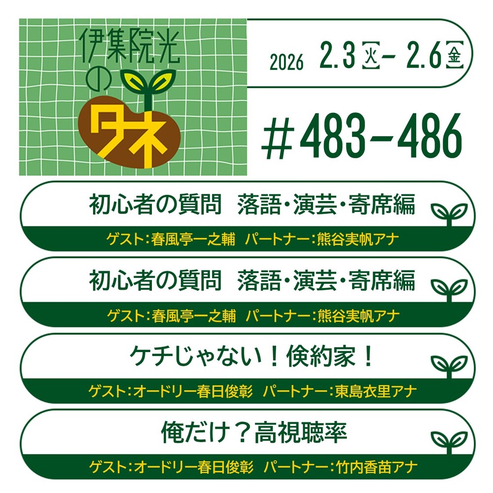 第483回~第486回 2026年2月3日~2026年2月6日放送『39.初心者の質問 落語・演芸・寄席編』『88.ケチじゃない!倹約家!』『76.俺だけ?高視聴率』