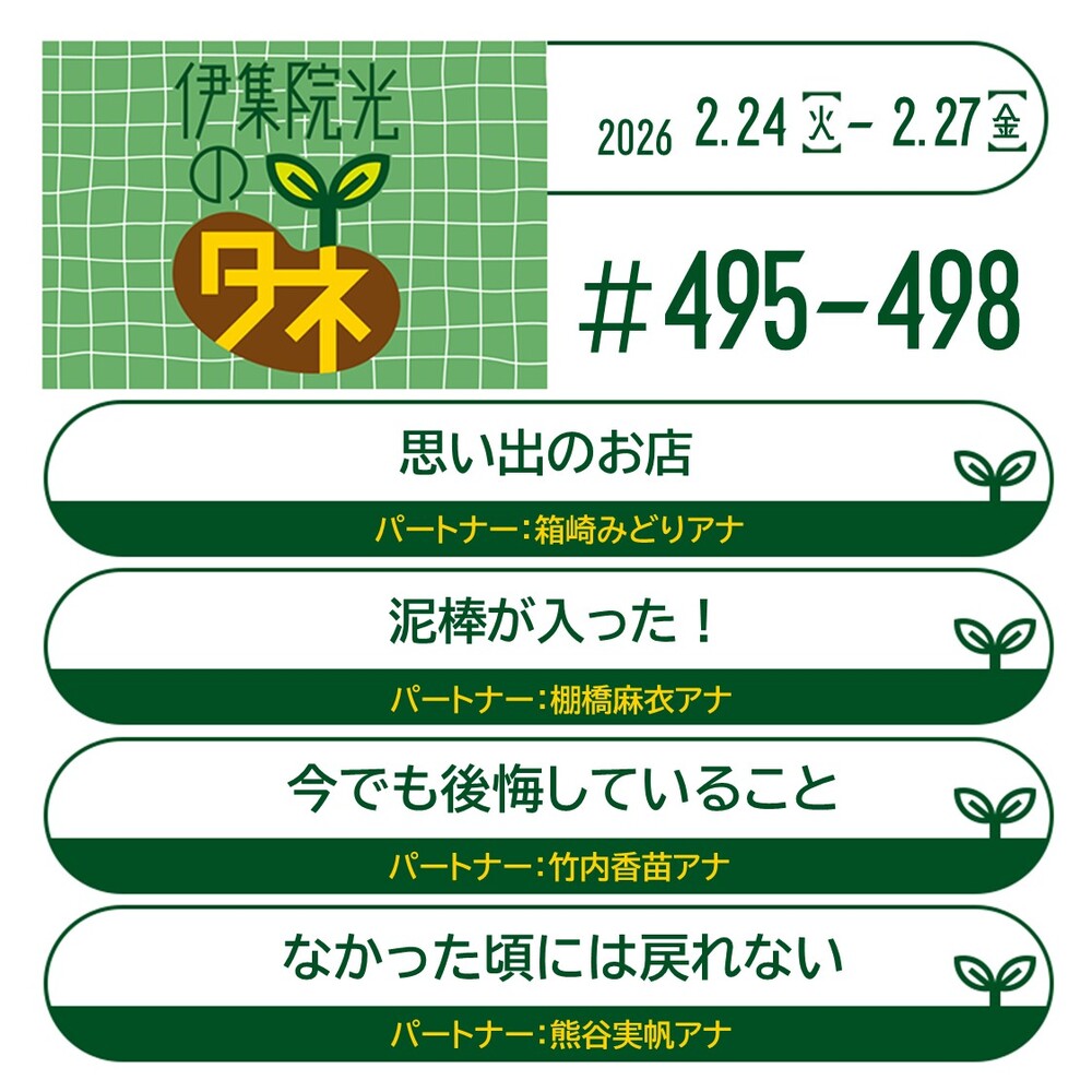 第495回~第498回 2026年2月24日~2026年2月27日放送『171.思い出のお店』『13.泥棒が入った!』『22.今でも後悔していること』『127.なかった頃には戻れない』