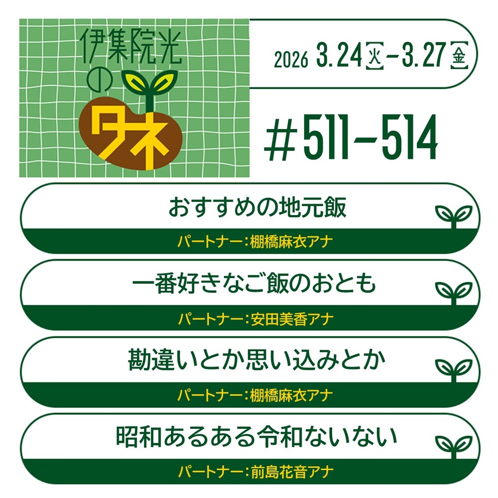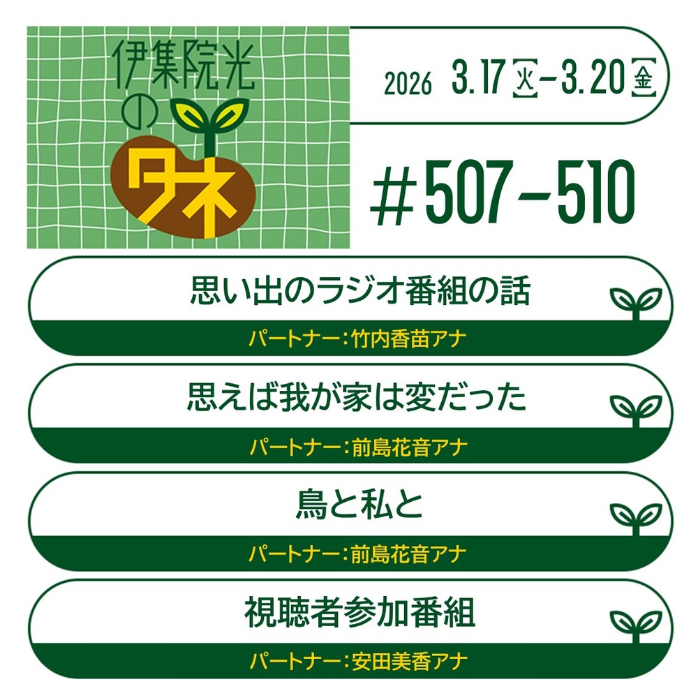 第507回~第510回 2026年3月17日~2026年3月20日放送『90.思い出のラジオ番組の話』『49.思えば我が家は変だった』『03.鳥と私と』『163.視聴者参加番組』